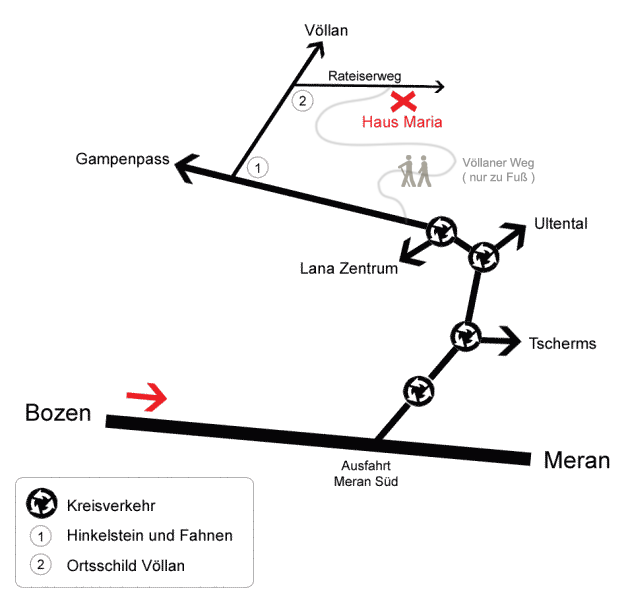 Falls Sie ein Navigationsgerät benutzen, vermeiden Sie bitte unbedingt den "Völlaner Weg" bzw. "Via Foiana"